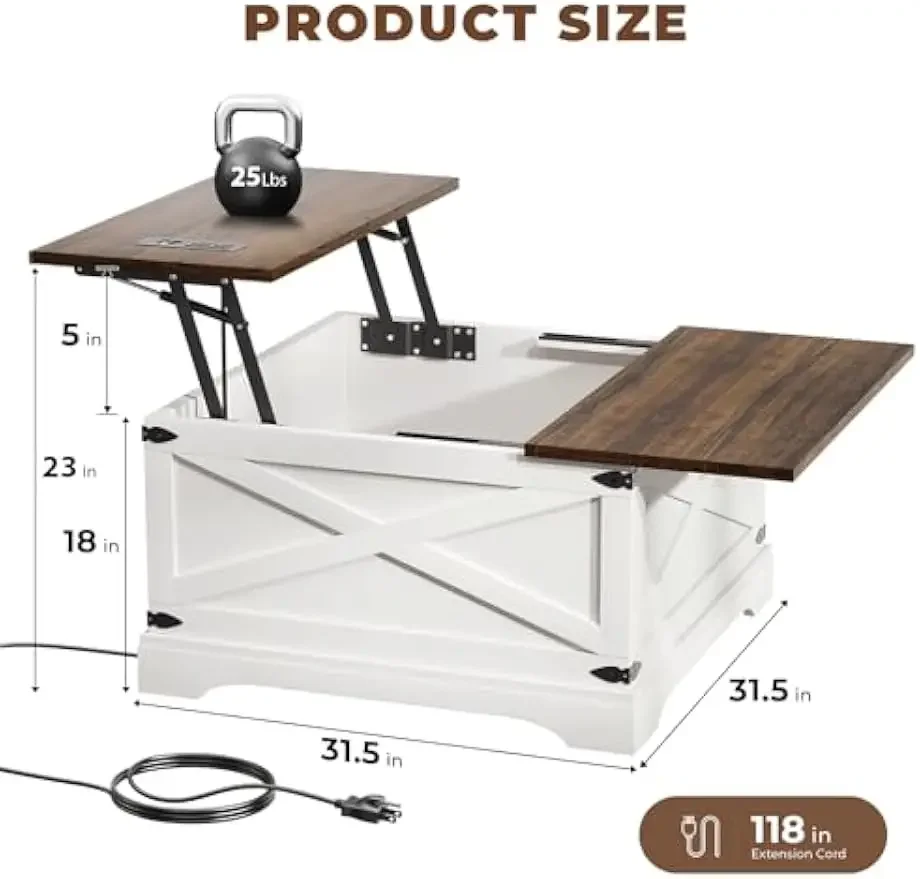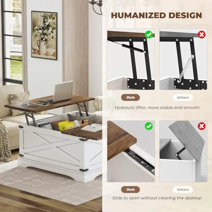 - 【Lift Top Design】The square coffee table top is divided into two, and one side is equipped with a stable lifting mechanism that can effortlessly lift the top 5 inches, turning it into a computer desk for comfortable work. The other side is equipped with smooth slide rails, allowing you to access the items inside the coffee table without having to clean the tabletop.