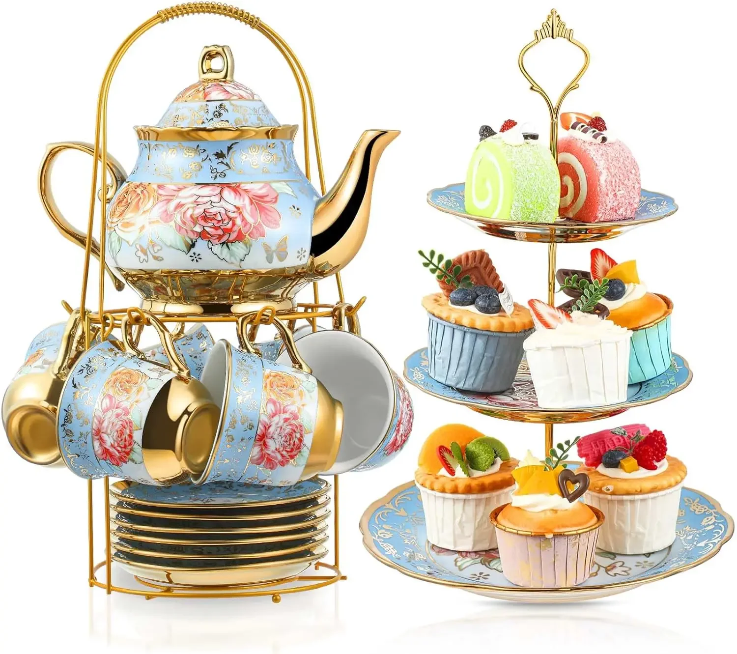 Safe Ceramic Material: the tea cup sets and 3 tier serving stand are made of quality ceramic, solid and reliable, safe and friendly, featured with European styles, shiny and attractive, the holder is metal, ideal for holding your tea set, to make your space elegant and charming