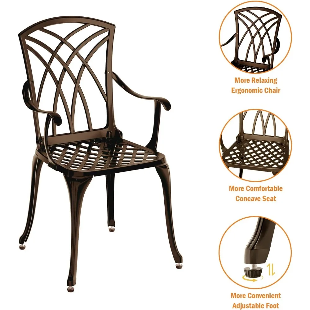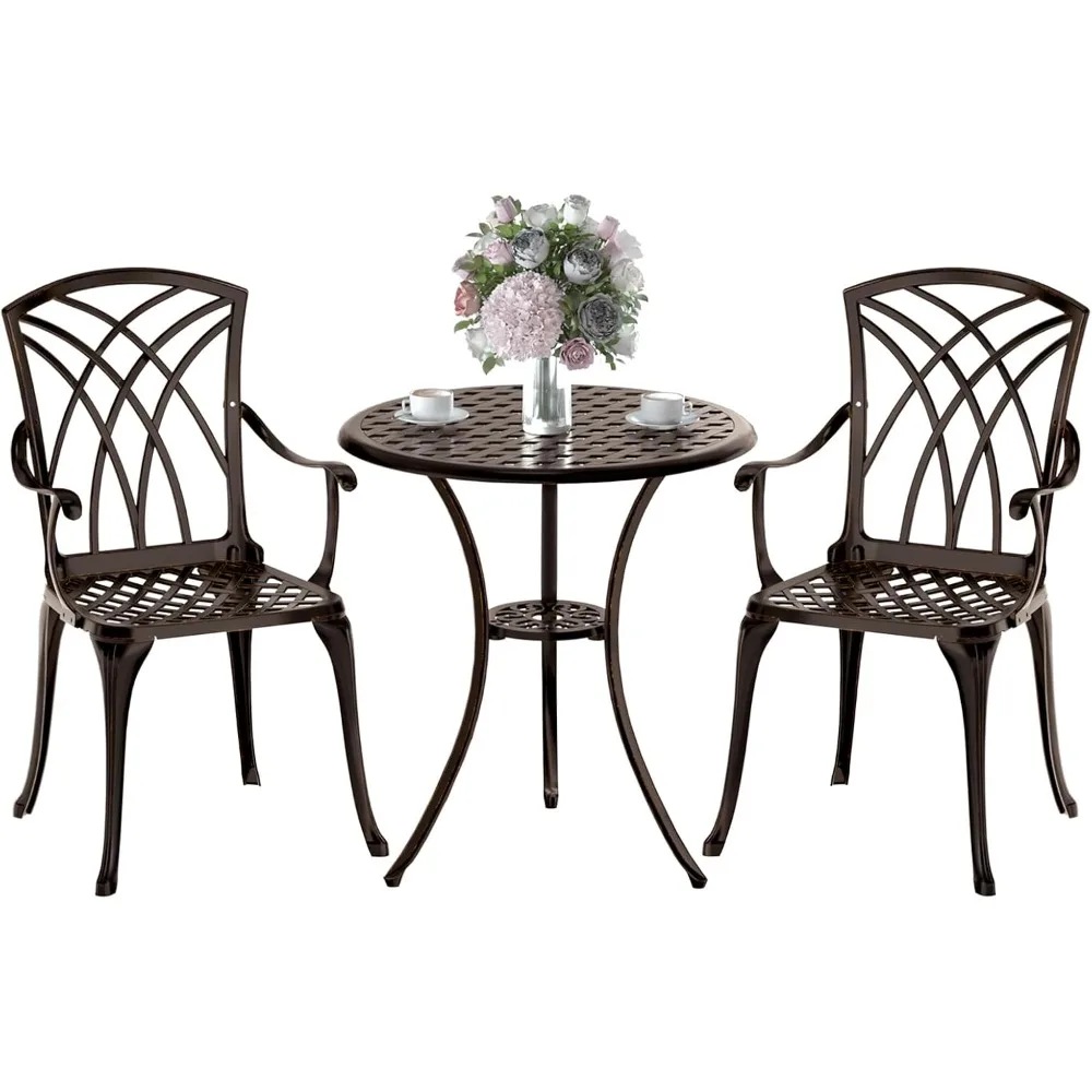 This bistro set is crafted from durable cast aluminum, which is resistant to rust and weather, making it perfect for outdoor use in any climate. The set includes a round cafe table and two chairs, with the table measuring 24 inches in diameter and 26.5 inches in height, while the chairs measure 18.5 inches in depth, width, and 35 inches in height, each capable of supporting up to 200 lbs. The chairs are designed with a slightly curved seat, hollowed backrest, and ergonomic armrests to provide superior comfort and support for extended periods of sitting. The table features an umbrella hole with a diameter of 2.4 inches, allowing for the use of an umbrella to create a shaded area. This set is ideal for balconies, patios, gardens, and lawns. Assembly is straightforward with a detailed instruction manual and all necessary accessories included. The set is lightweight and easy to move, and the anti-rust powder-coated surface makes cleaning a breeze.