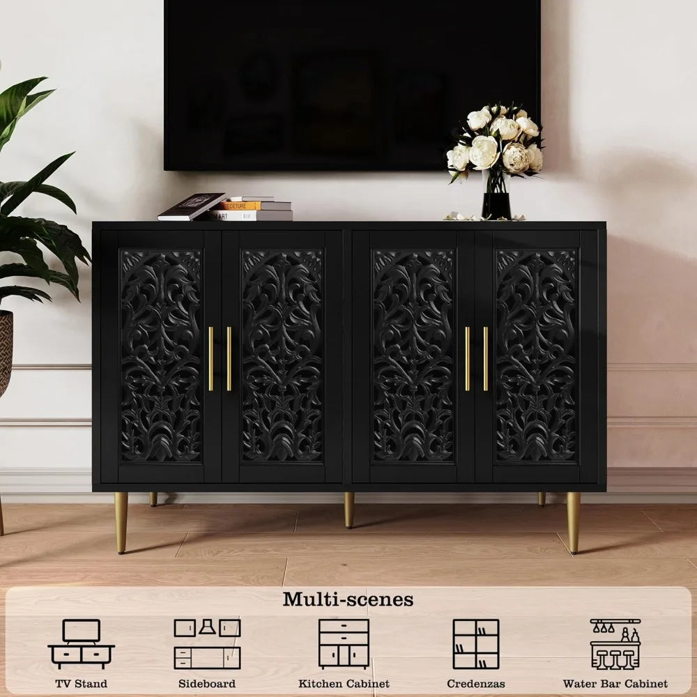 HUANZHUANG Accent Cabinet With 4 Doors Vintage Carved Buffet Storage