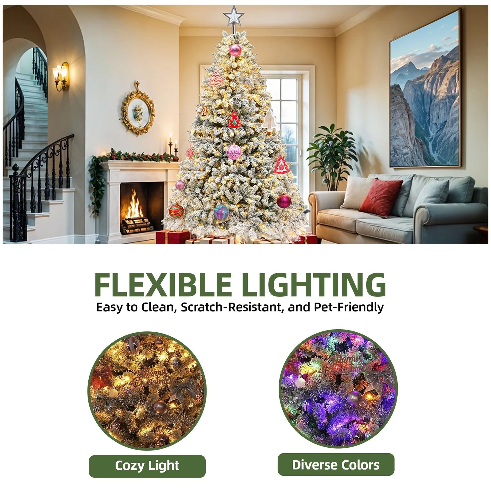 - 6 ft snow-flocked artificial tree with 1,000 adjustable branch tips gives you a lush, versatile canvas for your decorations and memories.