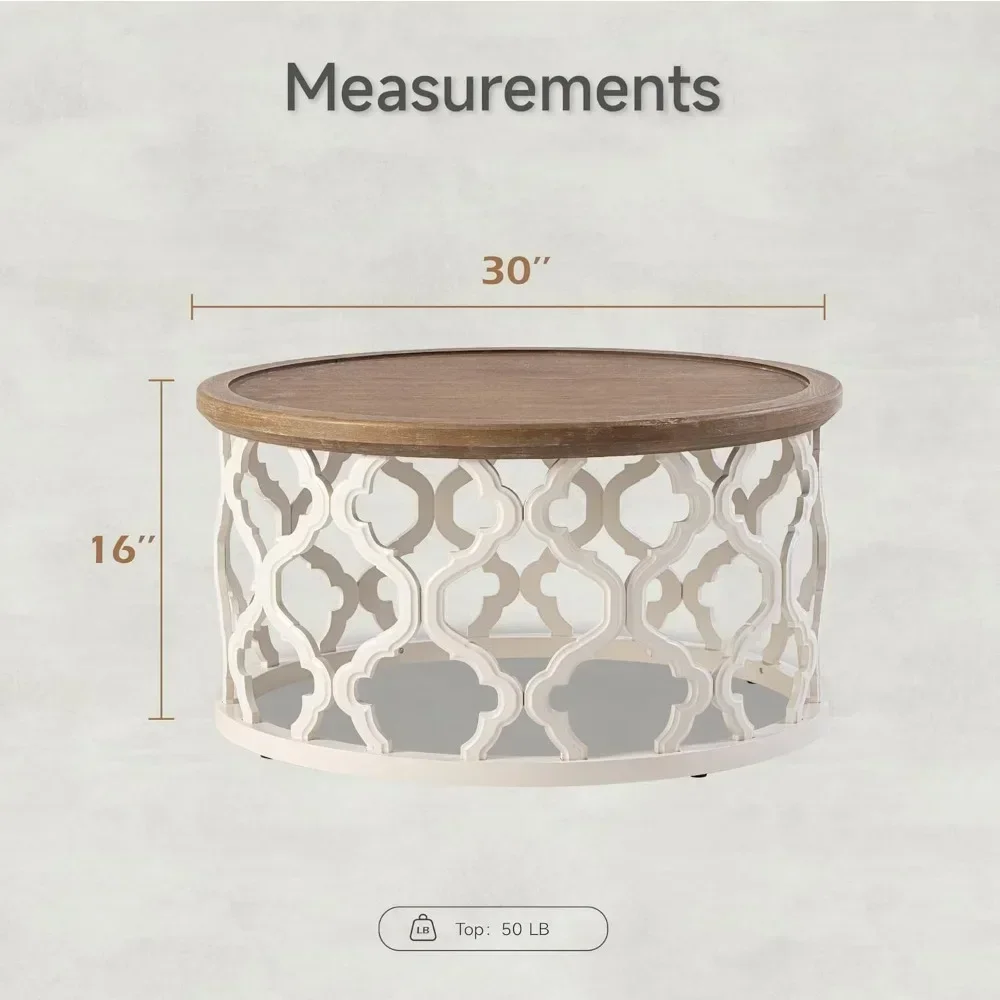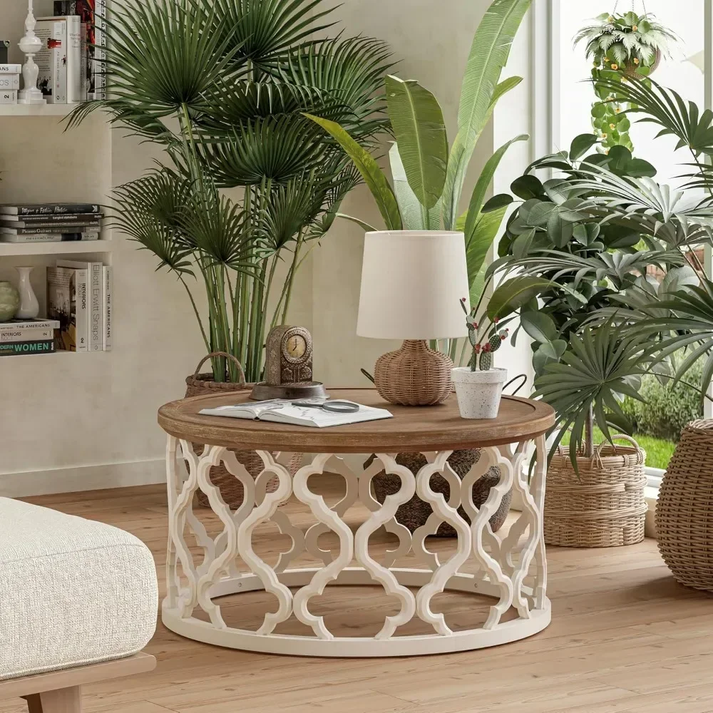 Farmhouse Coffee Table, Distressed Tray Top Table with Curved Motif Frame Base for Boho, Rustic, French Country Decor, Round,