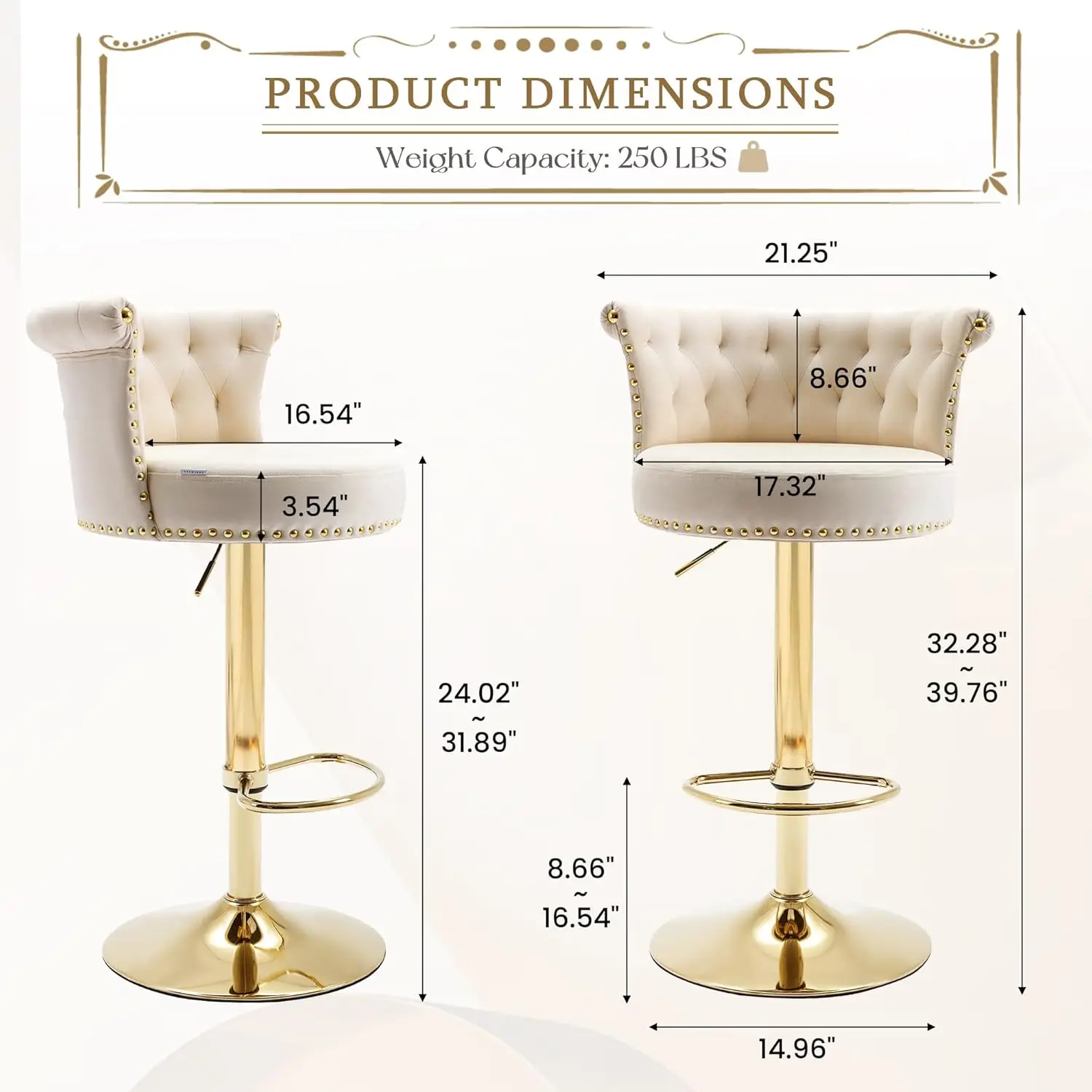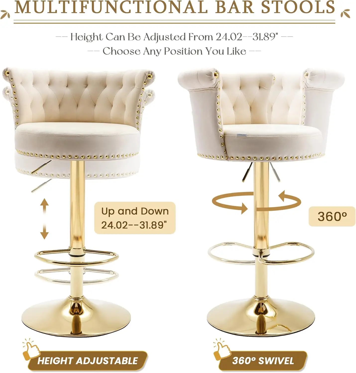 Bar Stools Set of 2, Modern Adjustable Swivel Barstools, Upholstered Tufted Velvet Counter Height Bar Stools Chair with Back and Footrest for Bar, Kitchen, Cafe, Dining Room, Beige