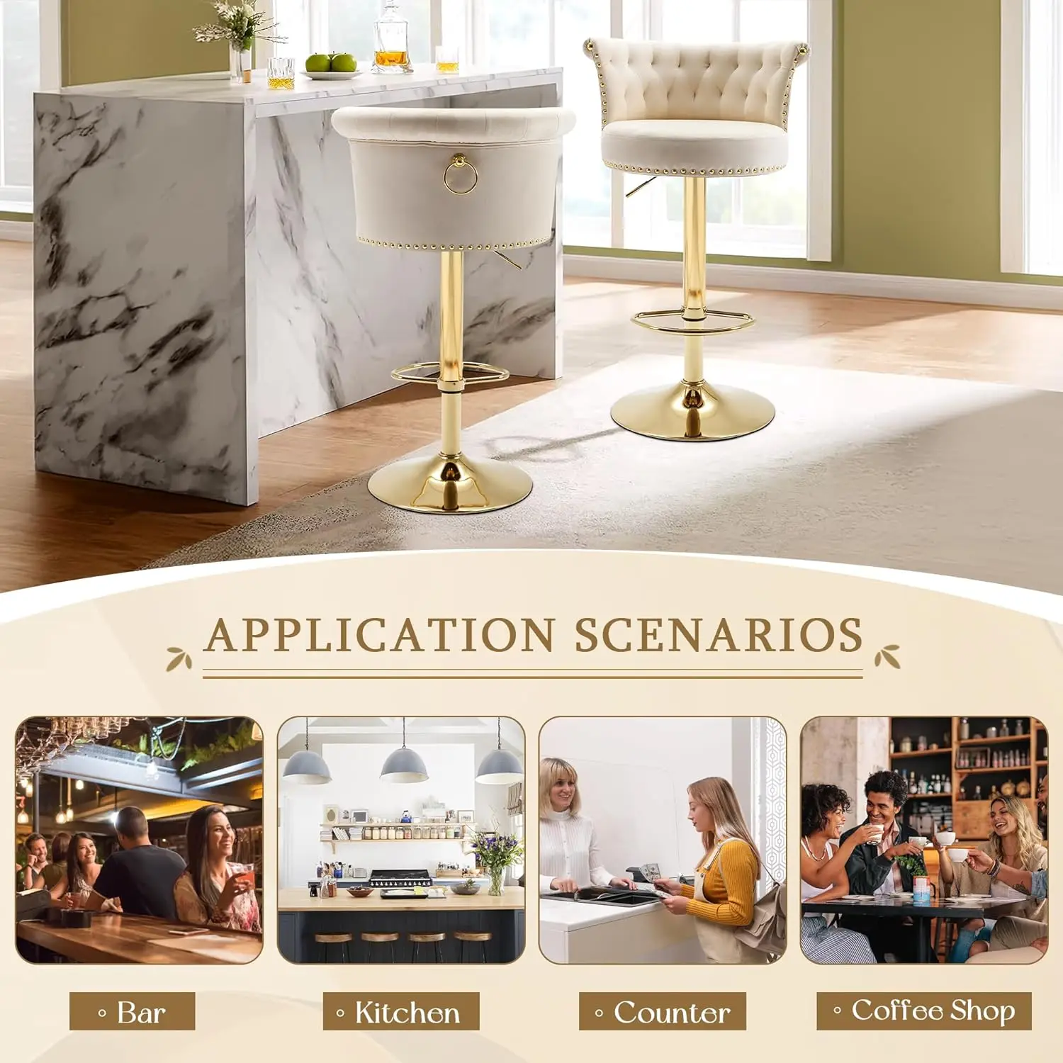 NEW Bar Stools Set of 2, Modern Adjustable Swivel Barstools, Upholstered Tufted Velvet Counter Height Bar Stools Chair , Beige