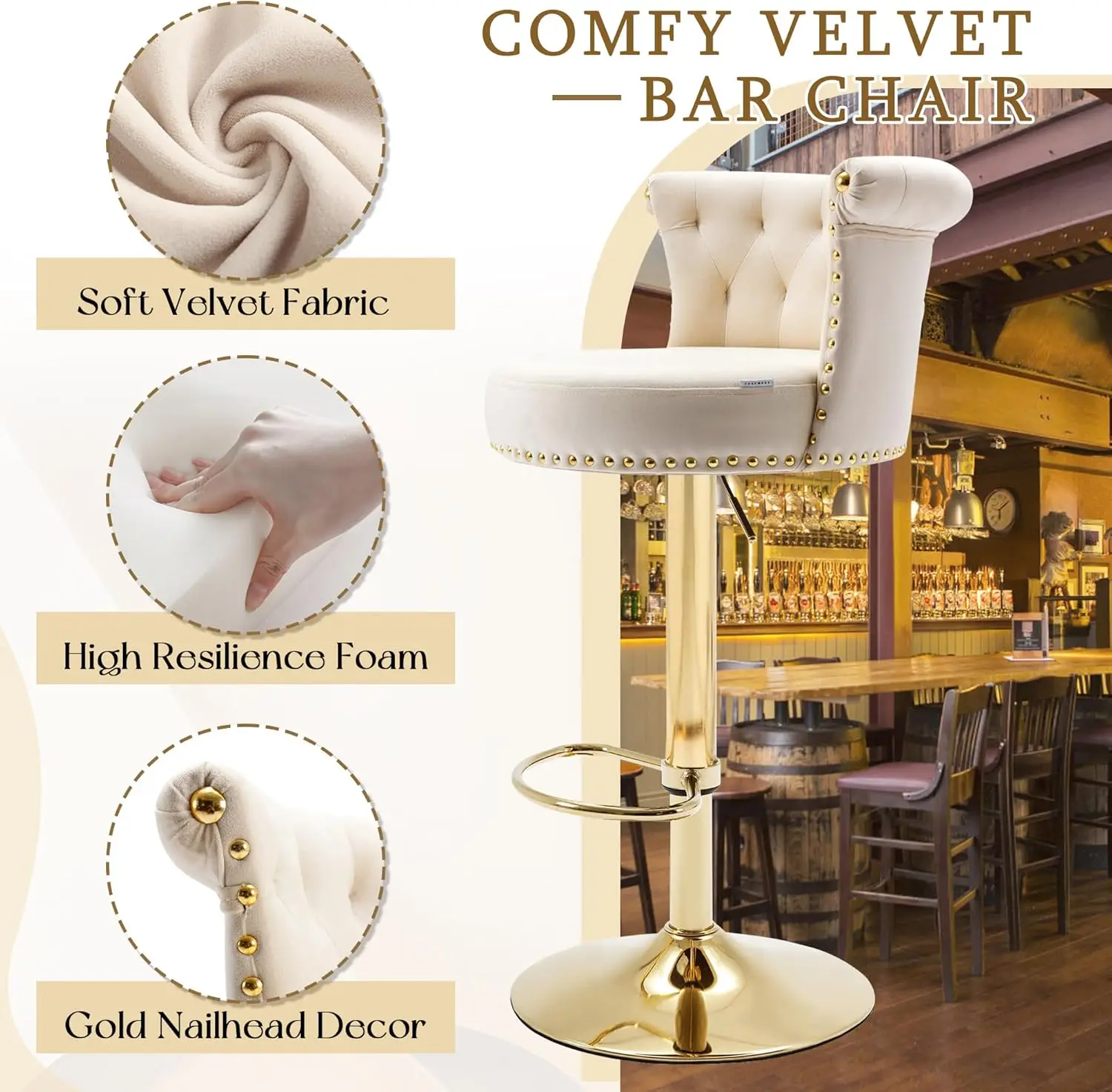 - 【Comfortable Bar Stool】 This swivel bar stool is wrapped in velvet fabric, soft and skin-friendly. The 8.66'' high backrest with a 3.54'' thick high-density foam seat cushion makes sitting more comfortable. The wide foot support can make your legs more relaxed, and you will not feel tired even if you sit for a long time