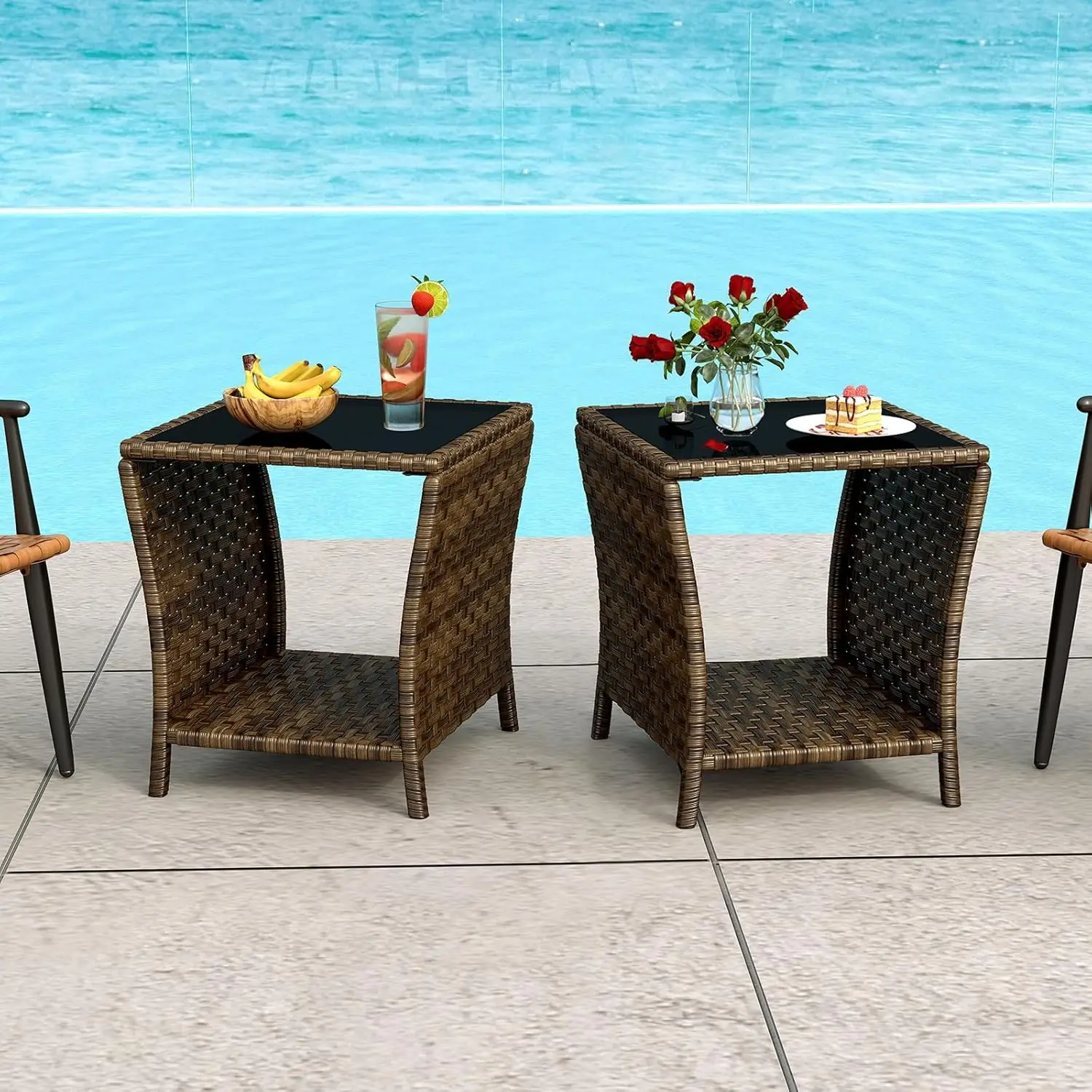 Easy-Clean Tempered Glass Top: The rattan end table features a scratch-resistant glass surface for effortless maintenance, ideal for snacks, drinks, or decor on patio tables for outside.