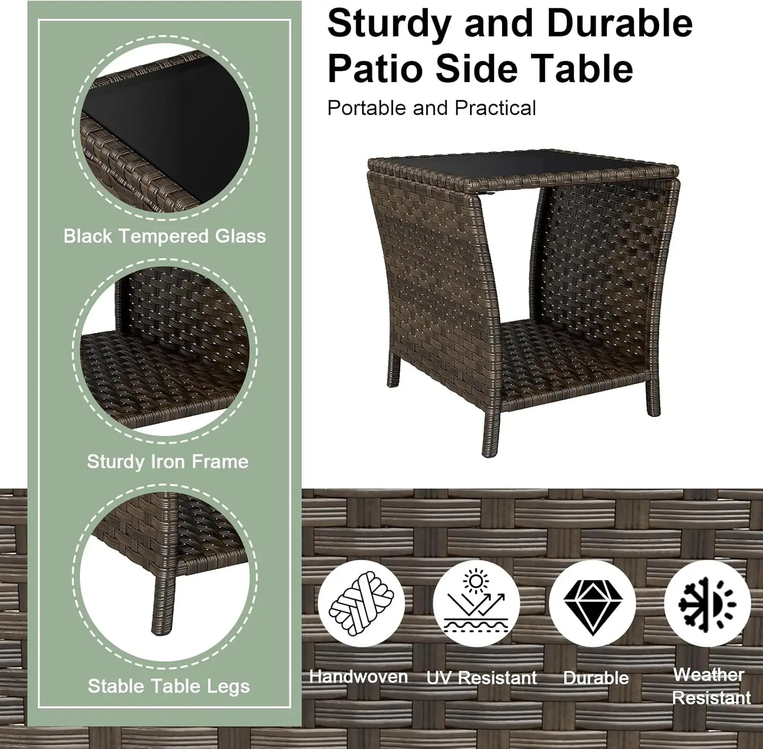 Sturdy & Weather-Resistant Build: Crafted with UV-resistant PE wicker and a heavy-duty iron frame, this outdoor wicker side table is not only steady and durable, but also lightweight and stylish.