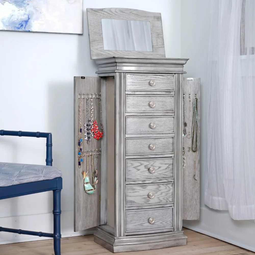 Standing Jewelry Armoire - Large 7-Drawer Wooden Organizer with Mirror, Side Doors, and Anti-Tarnish Lining - Smoke Grey