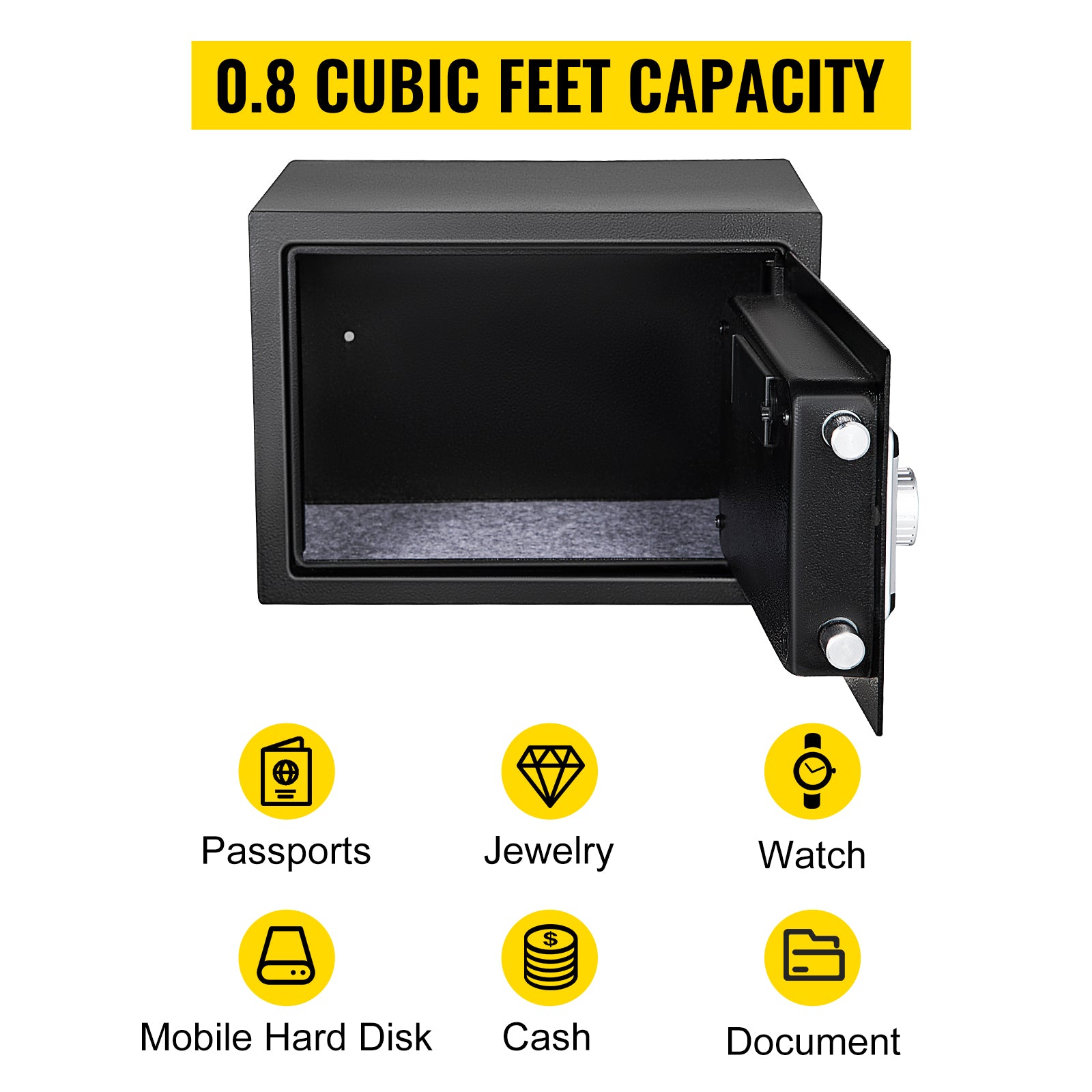 0.8/1.7/2.1C Large Capacity: The interior of this small safe is 0.8/1.7/2.1 cubic feet, and able to keep valuable items like passports, jewelry, watch, mobile hard disk, cash, document. Rest assured to use it to store your valuables, personal information. Also, the carpeted floor inside protects items from damage.