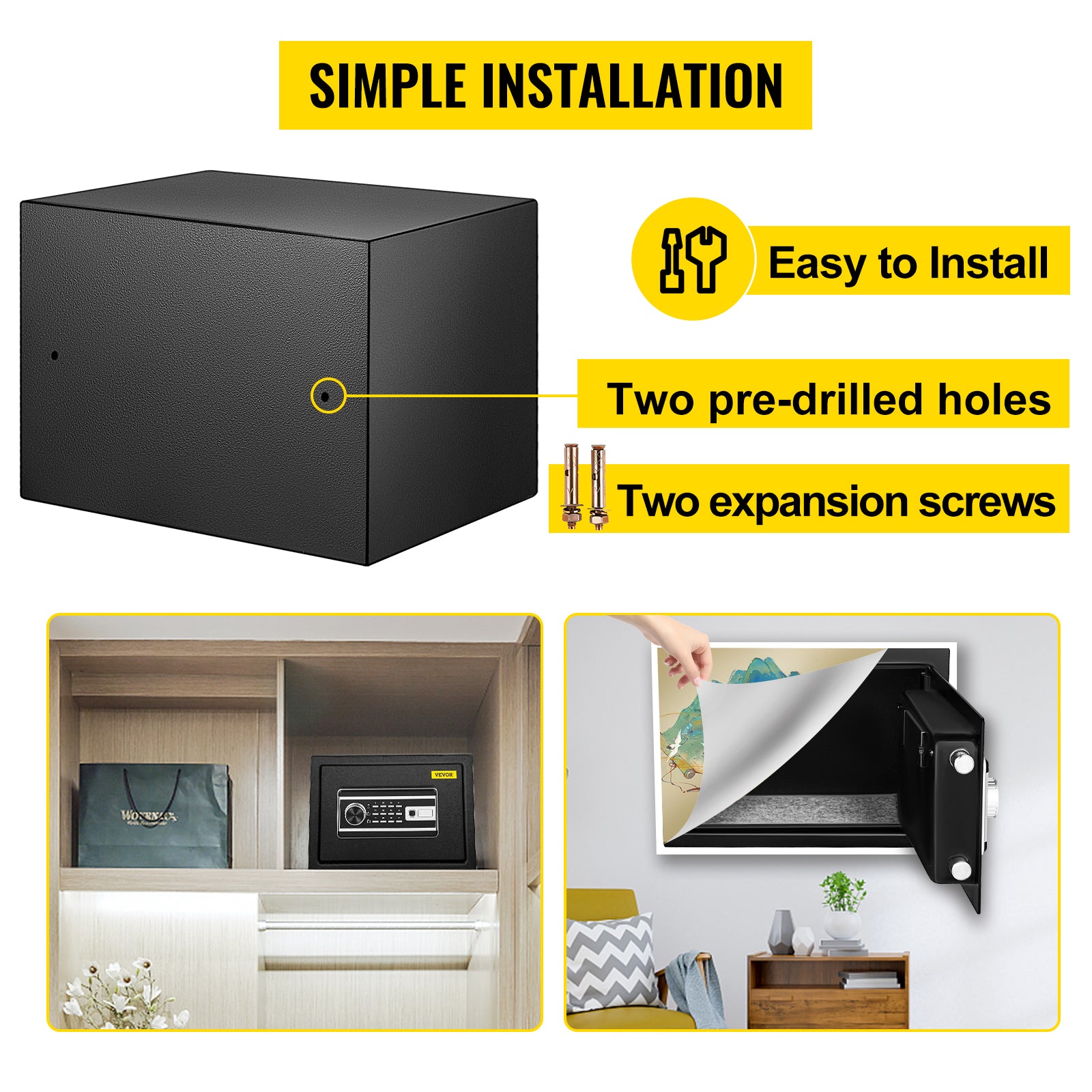 Wall Mounted Design: With two pre-drilled holes and two expansion screws, these safes can be quickly and stably installed on the wall, floor, or shelf for extra safety, ensuring they wouldn't be stolen. The black exterior finish gives it a handsome look that coordinates with any home or office setting.