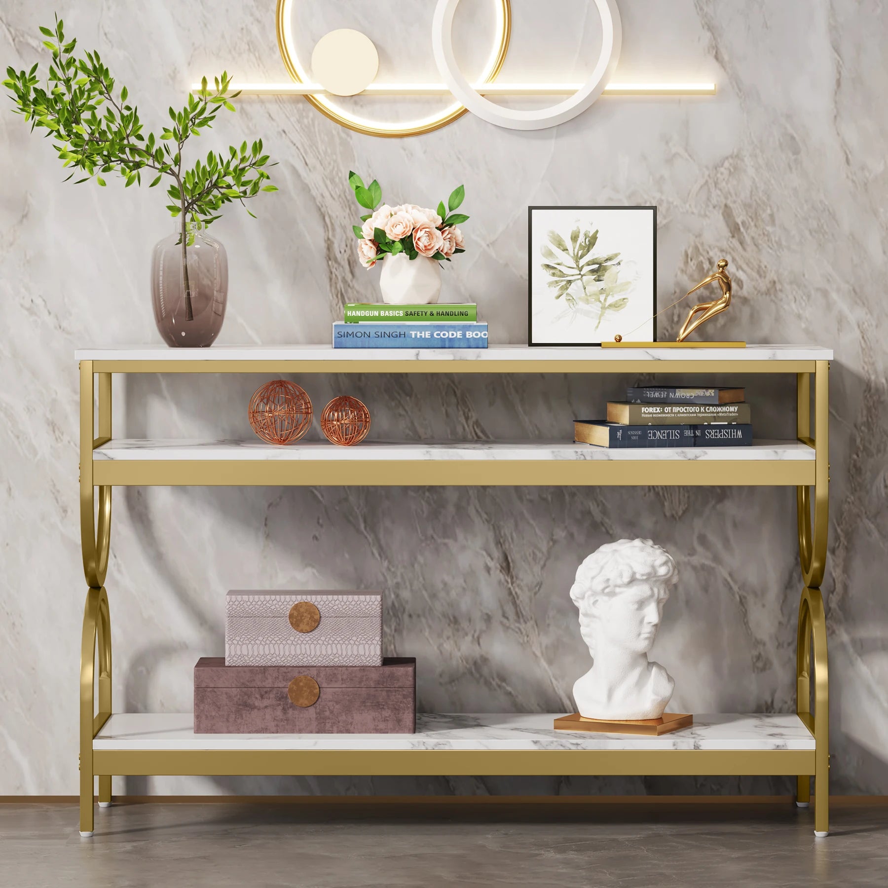 Modern yet Elegant Look: This console table exudes elegance and luxury with its white and gold color scheme and sleek design. The faux marble top adds a touch of sophistication, while the gold frame provides a striking contrast that catches the eye. Its classic yet modern look that will complement any decor style