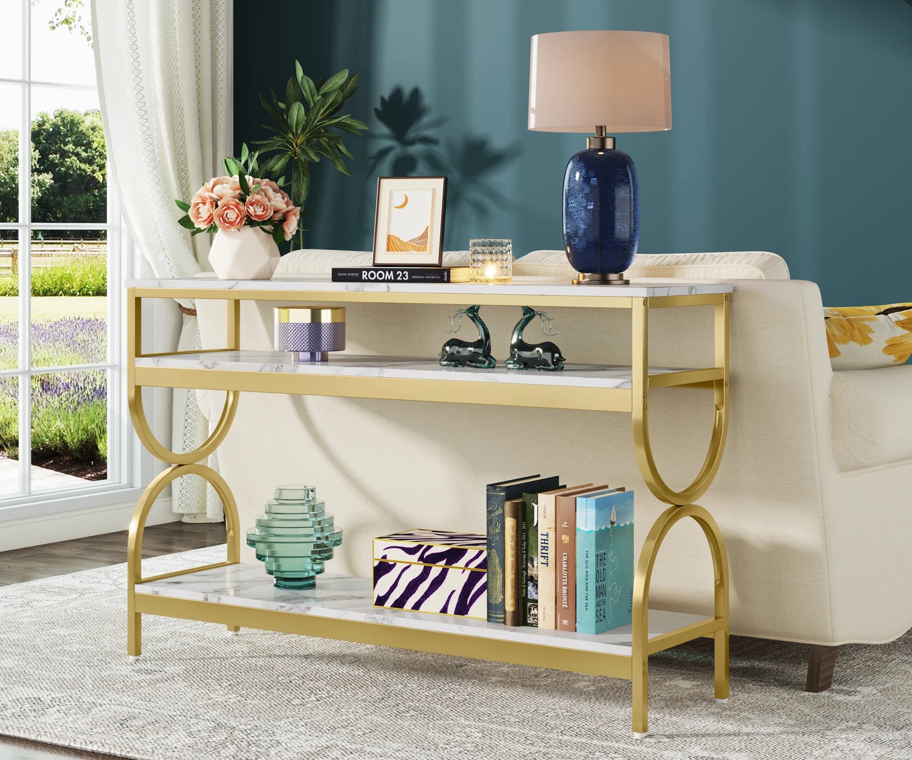Sofa Table with 3-Tier Storage: The tabletop in 55 inch length is great for keeping lamps, framed photos, and more precious decor. The lower shelves provide additional storage for staging a row of wire baskets and other daily items